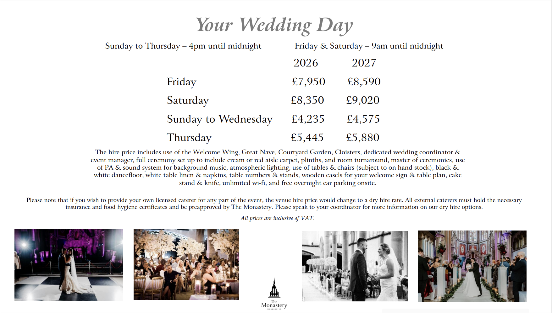 The Monastery’s exclusive use venue hire makes your wedding celebrations private and personal for you to share with your loved ones. Prices vary depending on the date, please click the button below to request a personalised quote for exclusive wedding venue hire.